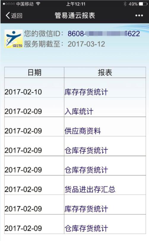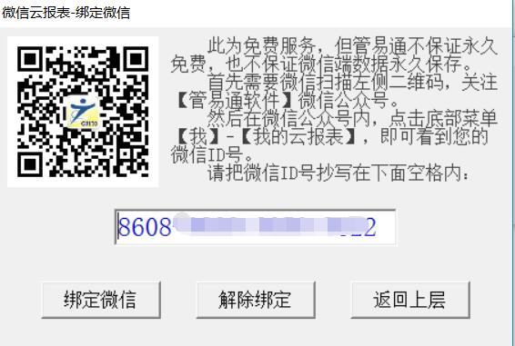 在上面的画面中,查看到您的微信ID,这是管易通为您分配的独一无二的序列号,将用于云报表绑定此微信。