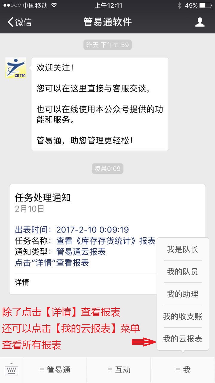 点击这里在线咨询 《管易通云报表升级版》也称为“微信云报表”,即可以在微信上方便的接收、查看管易通软件输出的报表。