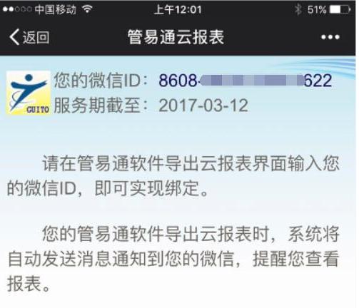 在上面的画面中,查看到您的微信ID,这是管易通为您分配的独一无二的序列号,将用于云报表绑定此微信。